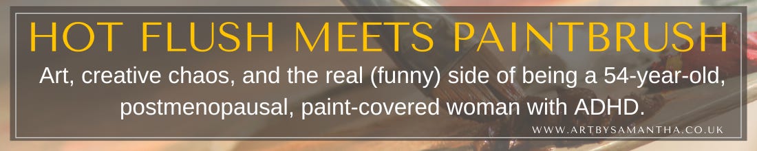 I'm Sam Biddle, a 54-year-old artist, postmenopausal powerhouse, and newly diagnosed ADHDer who’s still figuring out where she put the paint thinner (and her phone). This newsletter is a peek behind the curtain into my life as an artist — the glorious mess, the accidental brilliance, and the very real pile of unfinished cups of tea.